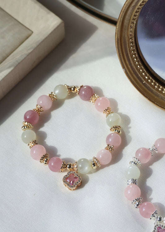 *Instocks* Celine - Chain with Snow Garden Rose Quartzes Heart, MOP Clover & MOP Flower Crystal Bracelet (OT Clasp)