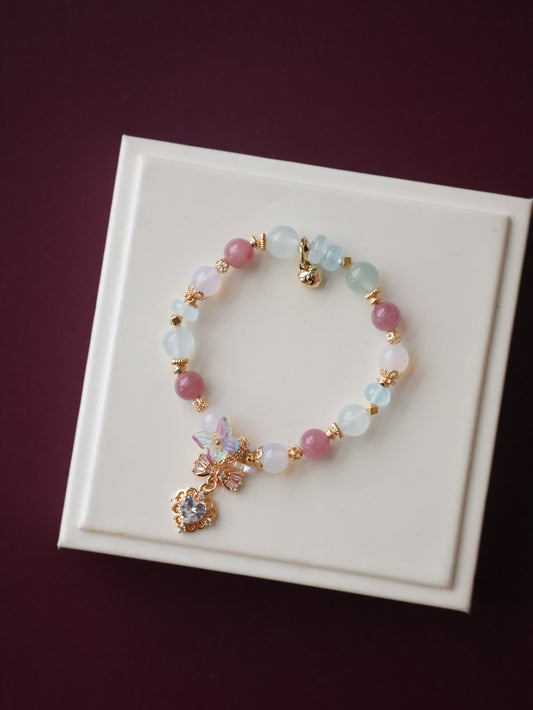 *Instocks* - Blossara - 8mm Blue Topaz, Aquamarine, Lilac Chalcedony & Lavender Rose Quartz with Dangly Sparkly Heart and Butterfly Rainbow Charm (Elastic)