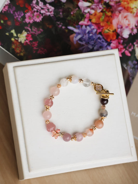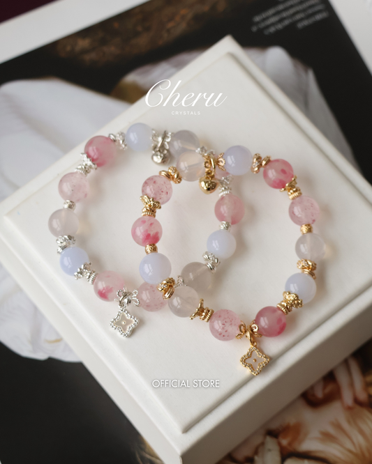 *Instocks* - The Luxe Edit - 10mm Strawberry Quartz, Blue Chalcedony, Rhodonite & Lavender Moon Quartz with Clover Charm (Elastic)