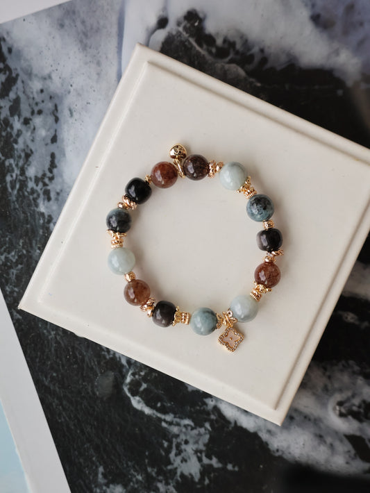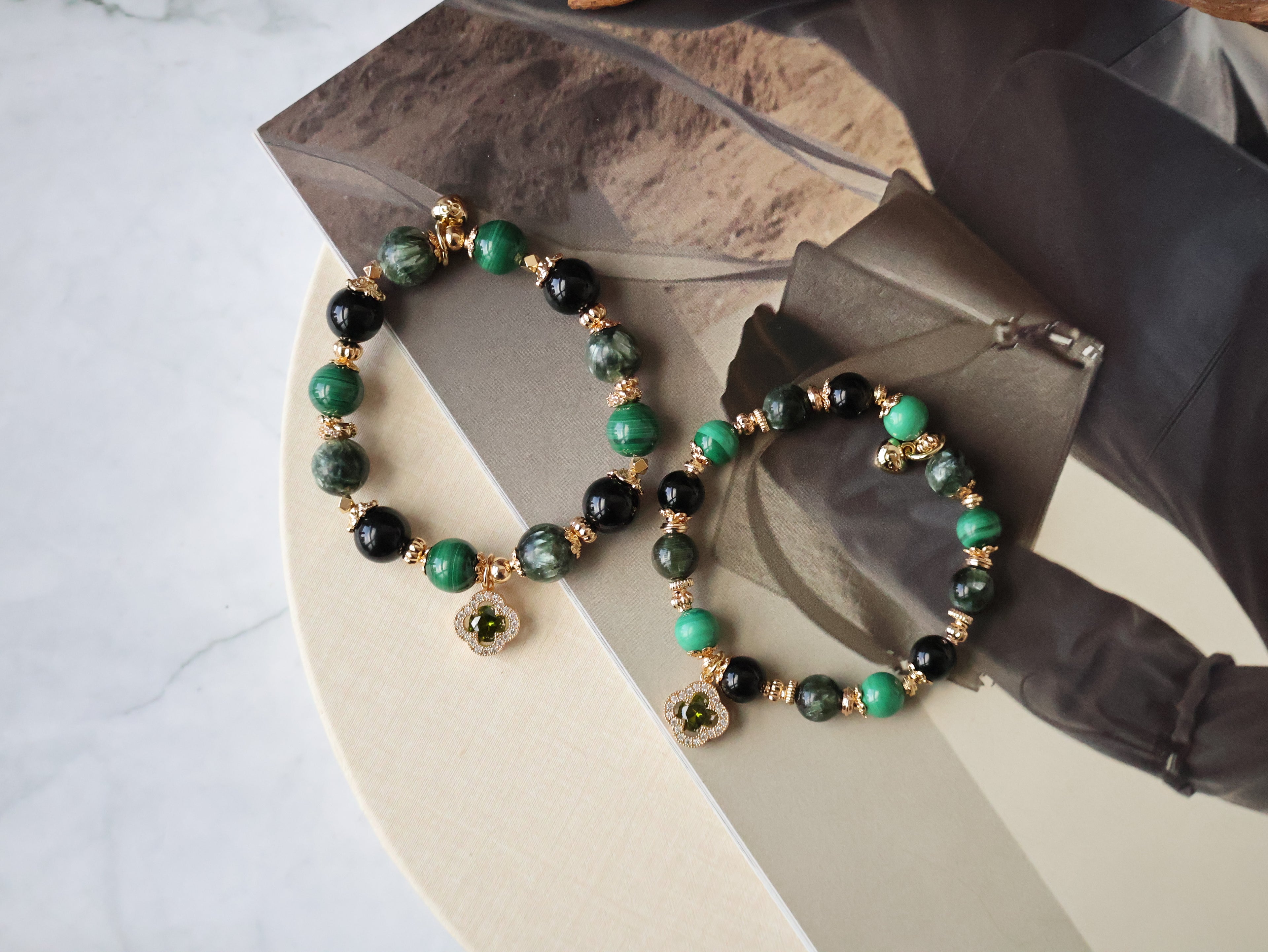 *Instocks* - The Luxe Edit - 10mm Black Obsidian, Black Gold Super 7, Devil Blue Aquamarine & Wuji Jadeite with Clover Charm (Elastic)