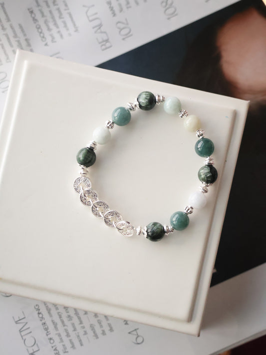 *Instocks* - Fengshui Coins Eirene - 8mm Seraphinite, Blue Water Jadeite & Green Jadeite (Elastic)