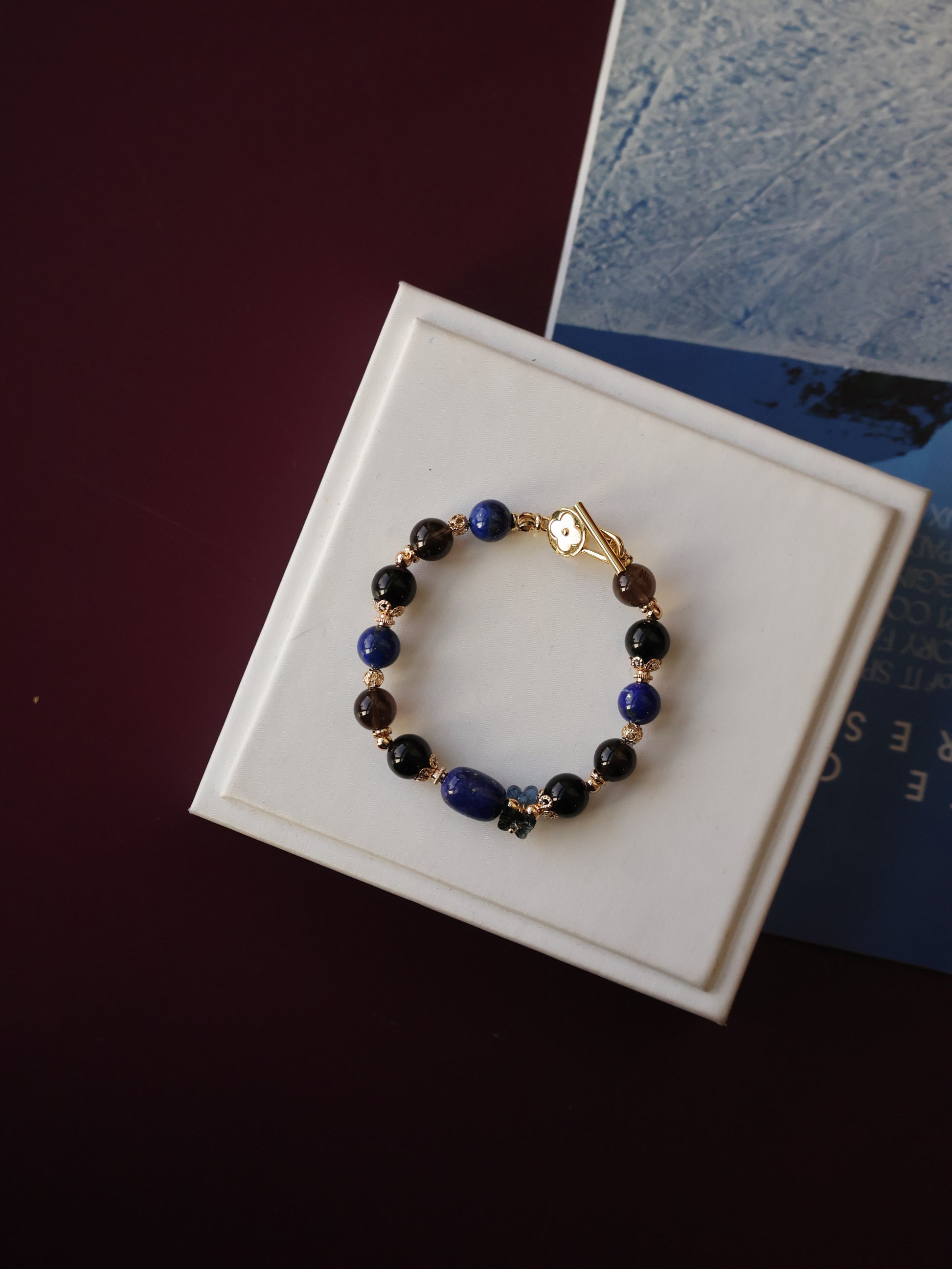 *Instocks* Lunaris- 8mm Lapis Lazuli Barrel, Black Obsidian, Smoky Quartz with Bouquet OT Clasp (Elastic)