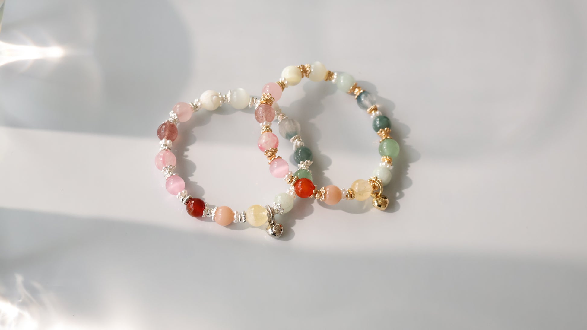 Crystals used for 10mm Duobao: Amethyst, Rose Quartz Drum Bead, Strawberry Quartz, Yan Yuan Agate, Sakura Rhodonite, Peach Moonstone, Citrine, Lemon Quartz, Yan Yuan Agate Drum, Green Jadeite, White Phantom Quartz & Blue Lace Agate