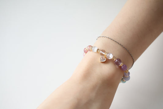 *Instocks* Rose Quartz Roses, Purple Fluorite & Milky Aquamarine with Heart Locket Natural Crystal Bracelet (Elastic)