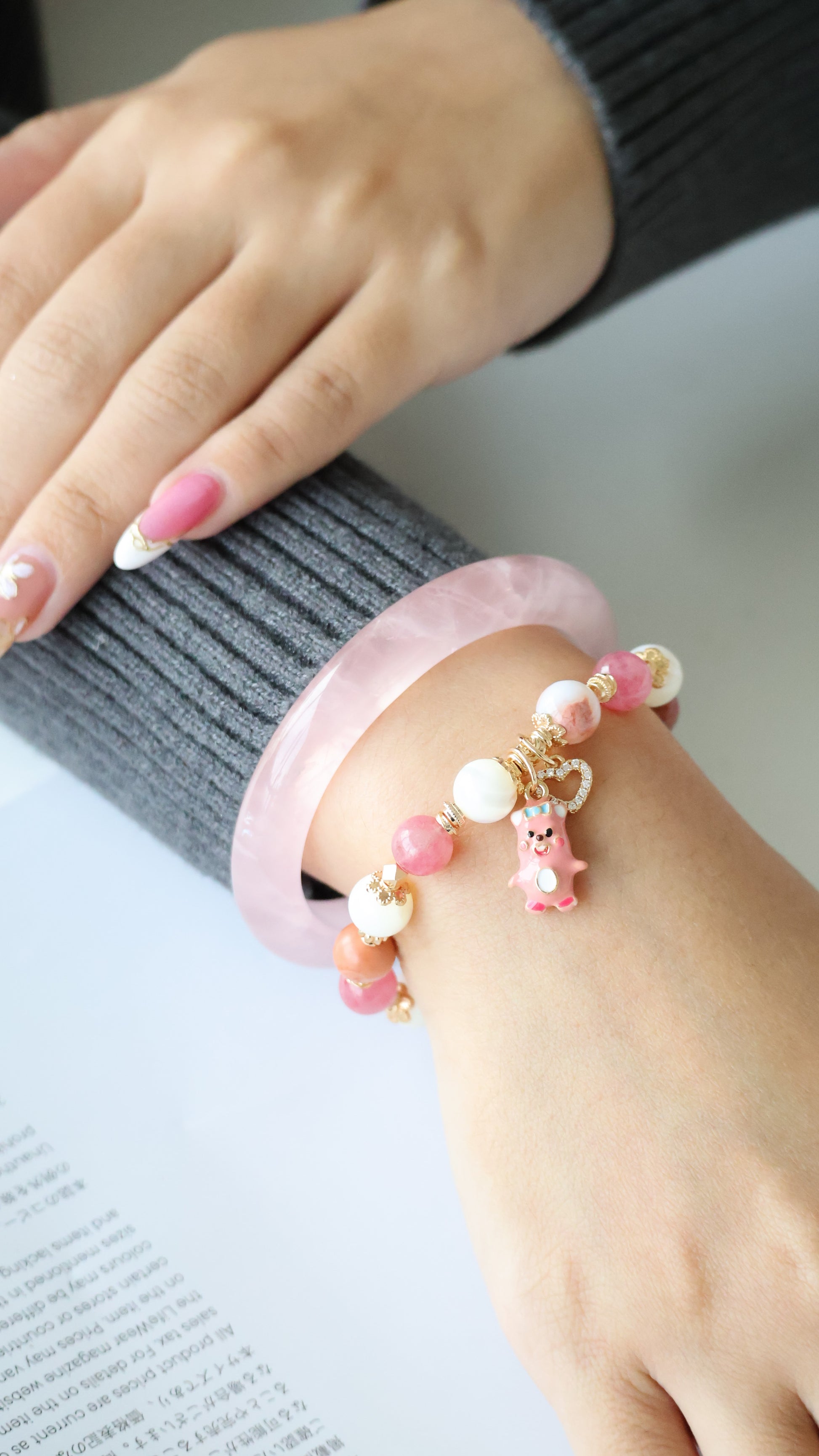 *Backorder* Loopy - Flower Agate, Sakura Rhodonite & White Conch with Loopy & Heart Crystal Bracelet (Elastic)
